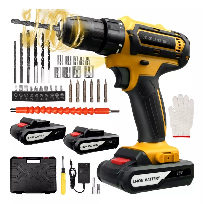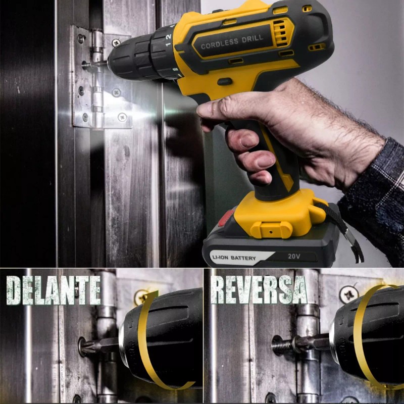 Destornillador fácil de operar: 2 velocidades y cambio positivo y negativo. Se pueden seleccionar diferentes velocidades de salida para diferentes entornos operativos. Equipado con dos baterías de litio recargable de 20V 1500mAh y un cargador rápido. Baja velocidad (0-350rpm) es mejor para atornillar y alta velocidad (0-1150rpm) es más eficiente para las tareas de perforación.