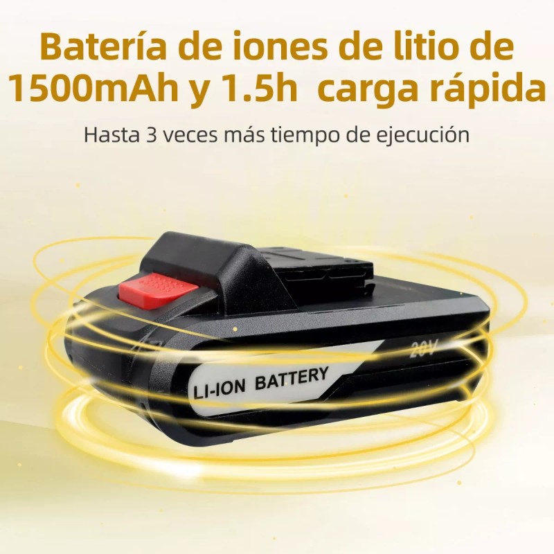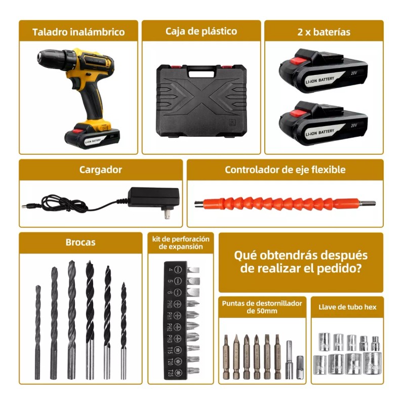 - Otros accesorios incluidos: 5 Ah *2,Llave de tubo *10,Taladro Atornillador *1,adaptador *1,batería de iones de litio de 1,broca de sujeción *1,brocas helicoidales * 6,cargador rápido *1,estuche de transporte * 1,kit de perforación de expansión,puntas de destornillador * 6