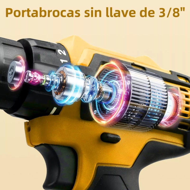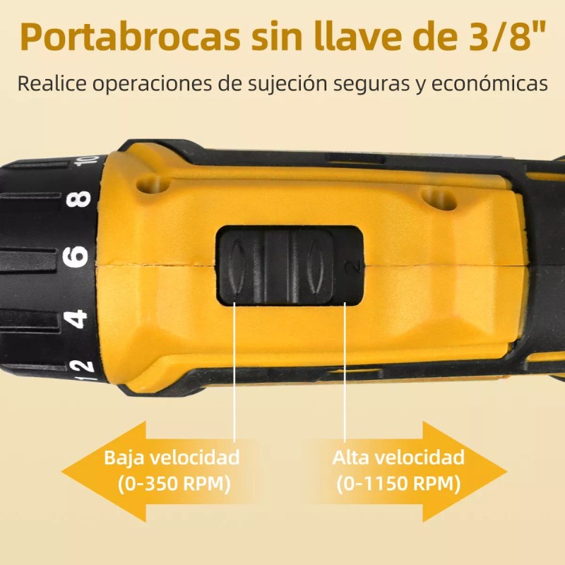 Portabrocas sin llave de 3/8 y diseño Ergonómico: El portabrocas de bloqueo automático de 3/8 "(10 mm) le ayuda a cambiar las brocas rápidamente. El taladro combinado inalámbrico le ofrece un agarre cómodo, equilibrado y suave.