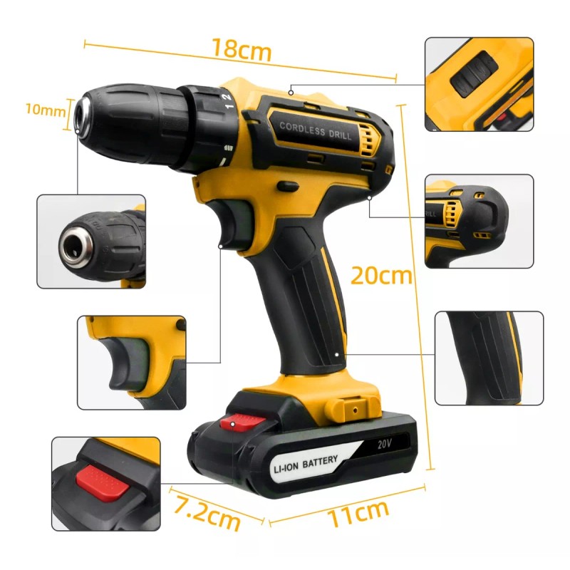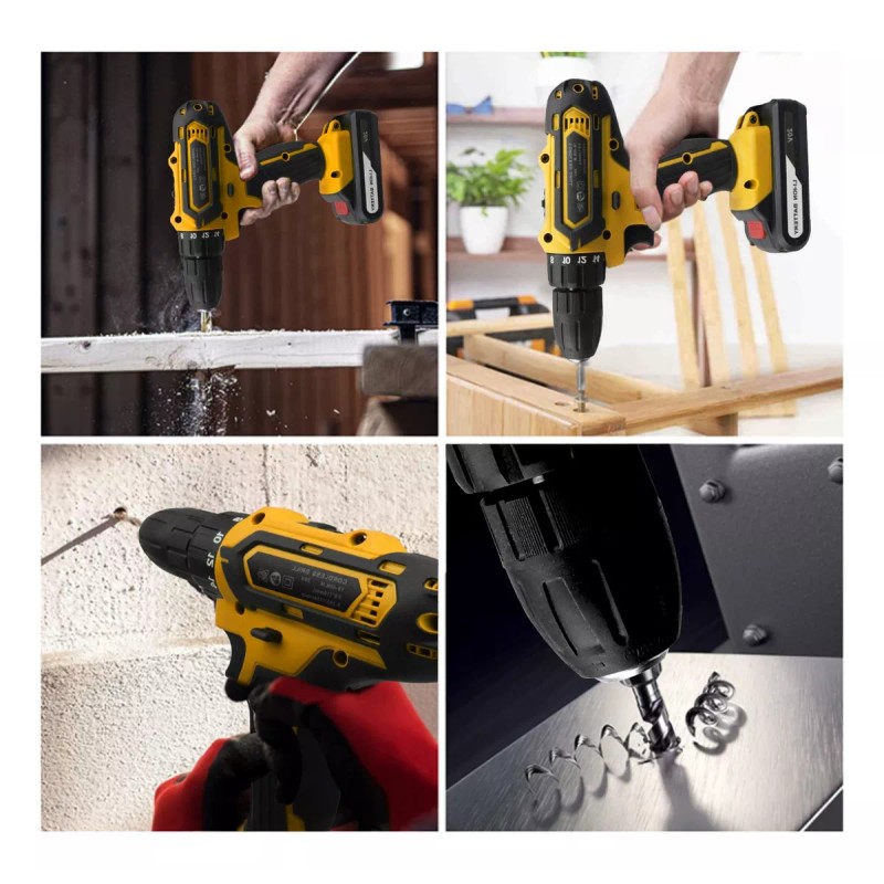 Un taladro/destornillador inalámbrico liviano que es útil para taladrar madera y metal. También se puede utilizar como destornillador para apretar y aflojar. Ajuste las diferentes velocidades del modo de máquina para lograr diferentes trabajos funcionales.
