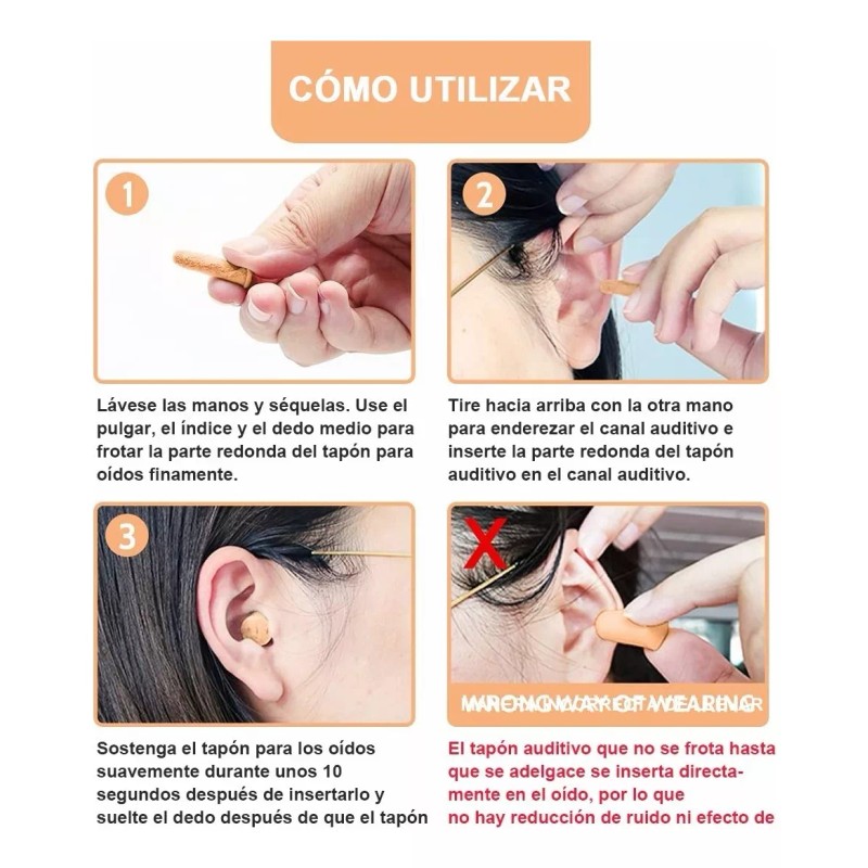7. Los tapones para los oídos de esponja son lavables. Lávelos con un líquido neutro como agua limpia, agua del grifo, etc., y colóquelos en un lugar fresco y ventilado. Se pueden usar después de que estén completamente secos.