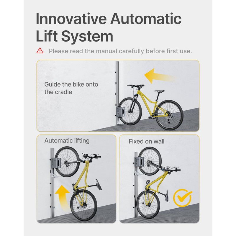 - QUICK AND EASY SETUP: Installing this automatic lift electric bike rack is quick and easy. No need for complex tools or professional skills. With simple, clear instructions, you can have your bike lift securely mounted in minutes. Ideal for those who value efficiency and simplicity