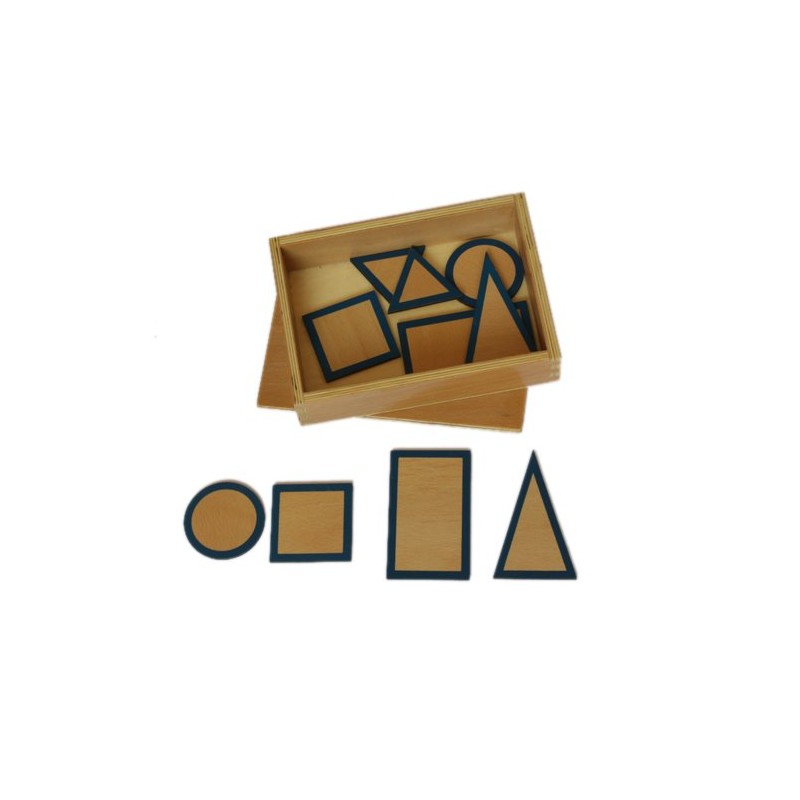 - A box containing 2 sets of 5 of wooden plane figures for geometric solids. Transition of understanding from the three dimensional geometric solids to two dimensional plane figures.