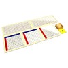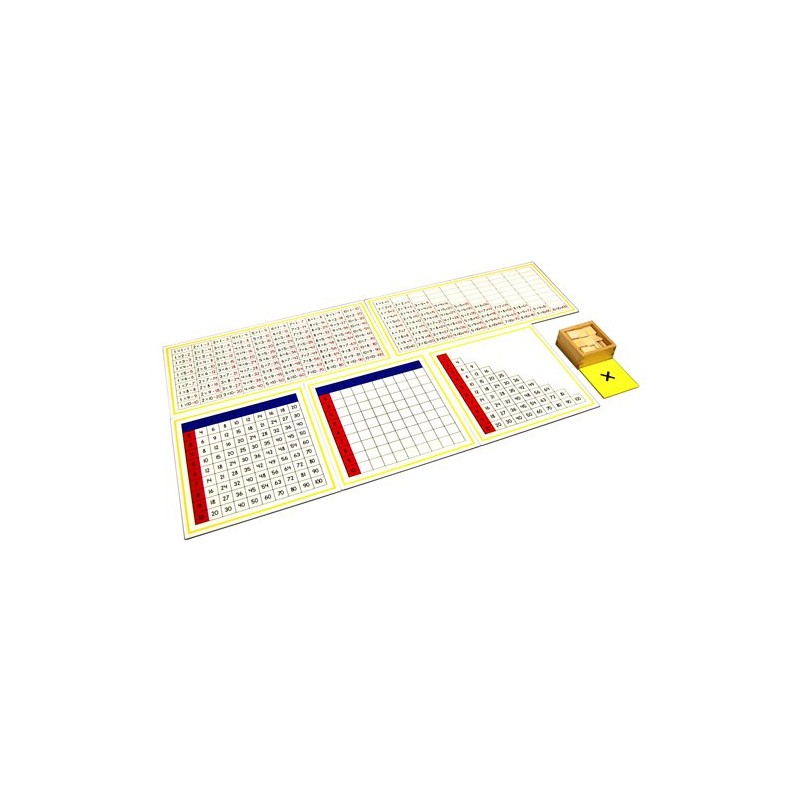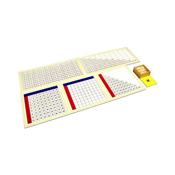 The material consists of two control charts, three working charts and a box of wooden product chips. The Multiplication Working Charts aid the child in practice and memorization of the multiplication tables 1 x 1 through 10 x 10.