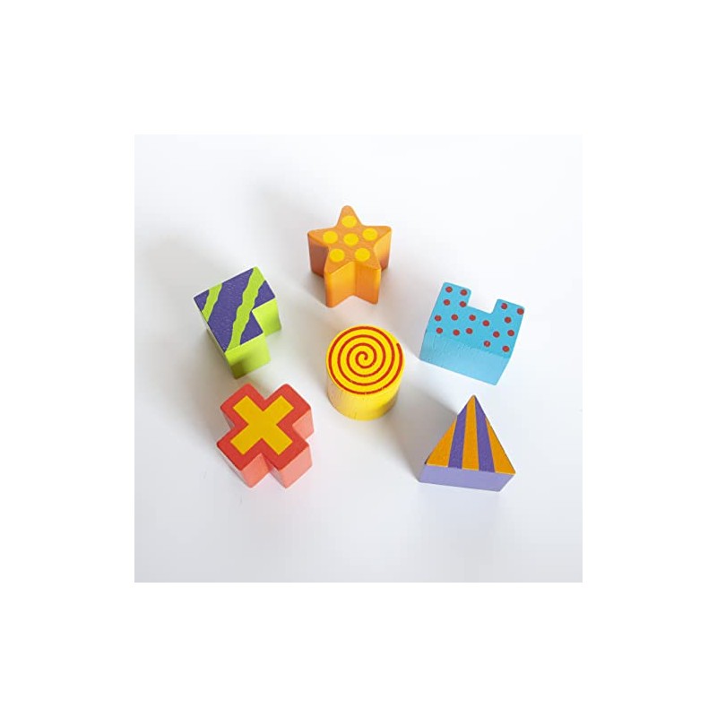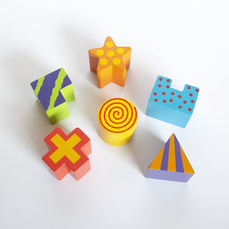 - Brightly colored, smooth sanded wood pieces help build early shape differentiation and small motor skills.