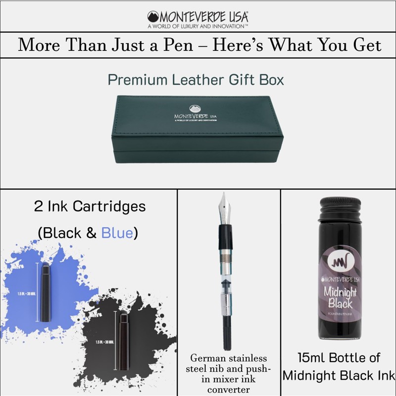 - Complete Fountain Pen Kit – Comes with a free 15ml Monteverde ink bottle, converter, and 2 ink cartridges for maximum versatility and convenience.