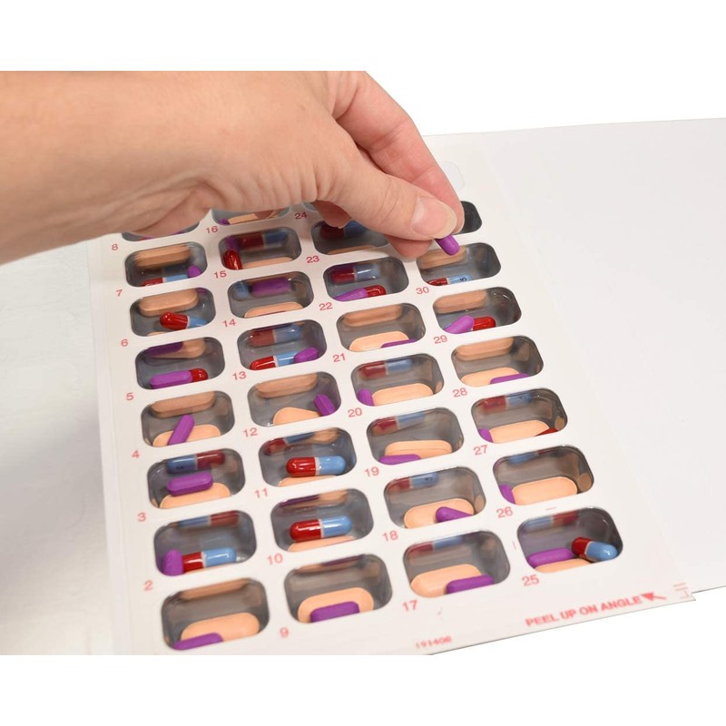 - NO ADDITIONAL EQUIPMENT NEEDED - EASY TO USE Just fill the clear blisters with your medications, peel off the backing, fold the left flap toward the center, and press with your hands. Turn over and press around the blisters to ensure a good seal then you can fold the remaining flap to close over the blisters. No additional trays and Cold Seal means no sealing equipment needed for our Medication Pill Blister Packaging System.