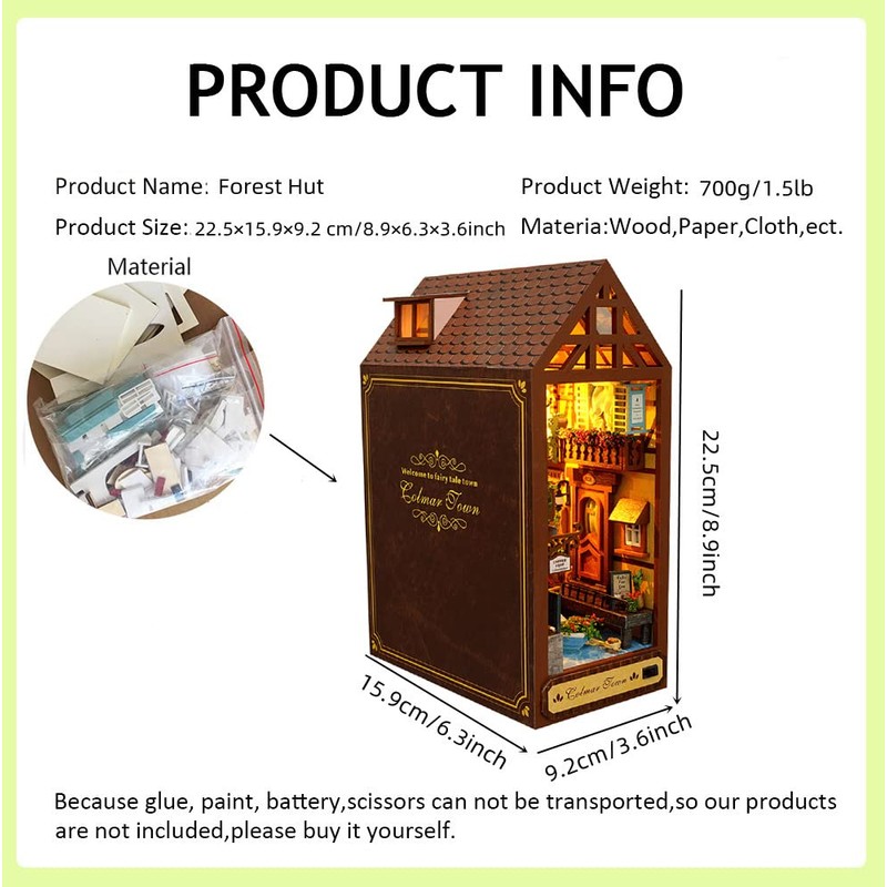 1. The package does not contain paper scissors, knives, tweezers, screwdrivers, rulers, Silica gel liquid glue and batteries . Please be prepared before assembling the doll house.
