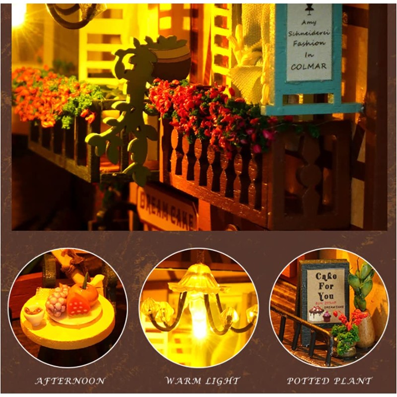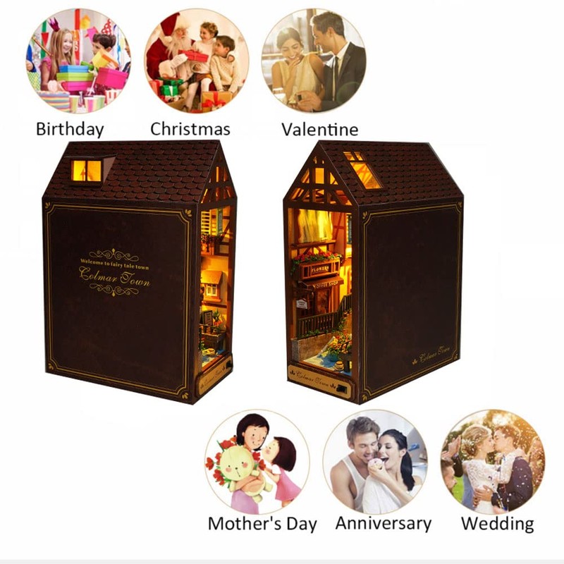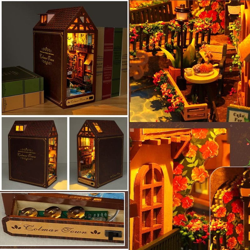 Montidey 3D Wooden Book Stand Puzzle DIY Book Nook Miniature Kit DIY Dollhouse Wood Bookends Book Nook Model Building Kit with LED Light One Size
