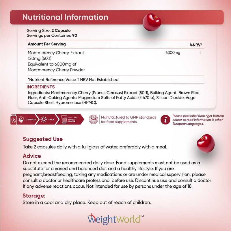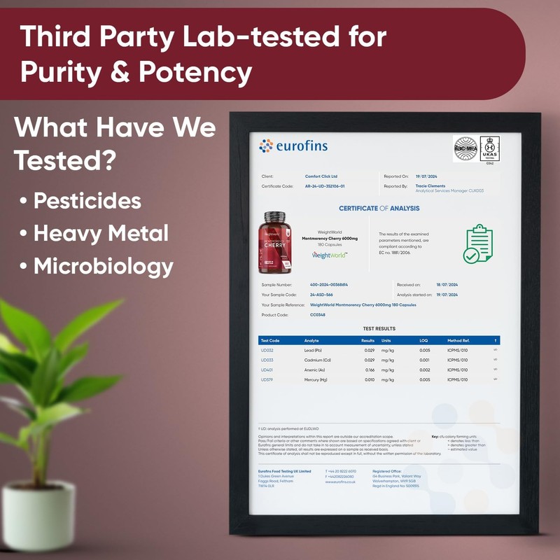 LAB TESTED FOR QUALITY – These Montmorency cherry capsules are independently tested by a 3rd-party lab (AgroLab) to ensure potency and purity. Manufactured and certified in the UK under GMP guidelines, our products undergo rigorous testing, ensuring top-quality performance. If you're not completely satisfied, please contact us—we're here to help!