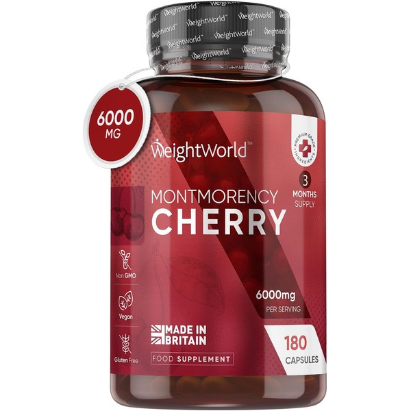 Montmorency Cherry Capsules 6000mg – 180 Tart Cherry Capsules (3-Month Supply) – 50:1 Natural Tart Cherry Extract Supplement for Men & Women – Vegan, Gluten-Free, Non-GMO, Lab-Tested – Made in The UK