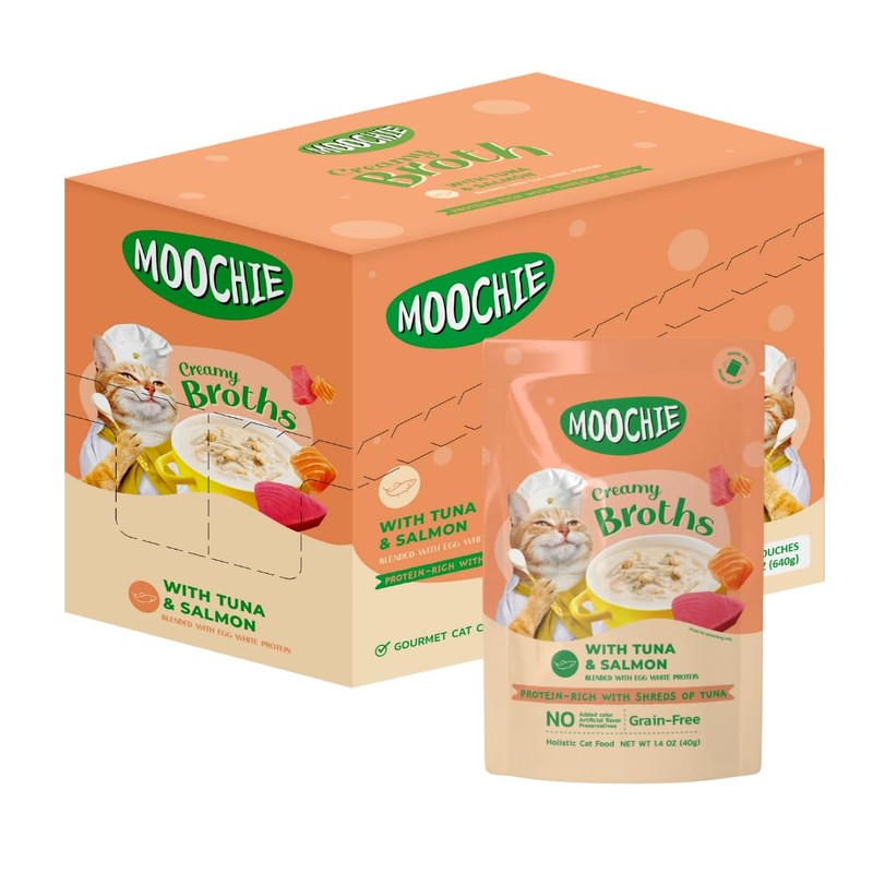 MOOCHIE Creamy Broth for Cats - Grain-Free - Made with Real Salmon & Tuna - No Artificial Flavors or Preservatives - 1.4 oz x 16 Pouches