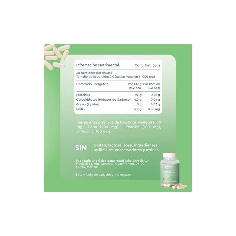 Moods - Moods Relax | Suplemento para Relajación y Calma con GABA, L-Teanina, L-Tirosina y Semilla de Uva - Vegano - 60 Cápsulas - Just Chillin'. 💯 Autenticidad y máxima durabilidad comprobadas. Diseño ergonómico y funcionalidad excepcional. 🎯 Producto más buscado del mes. Ideal para quienes buscan lo mejor en calidad y estilo. Producto auténtico con satisfacción total asegurada. ¡No te quedes sin el tuyo y aprovecha esta oportunidad única!