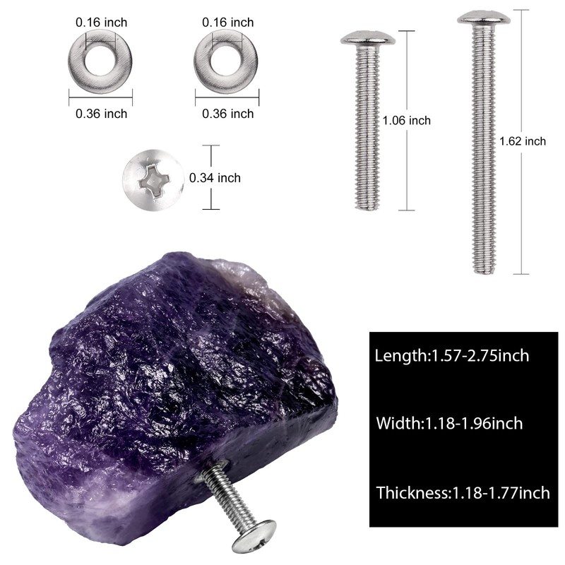 • Unique Crystal Drawer Knobs: The stone handle pulls consists of natural raw stone and stainless steel screws. Because stones have high hardness, abrasion resistance and toughness are strong, the stone knobs will be high quality and durable. Natural raw crystals, they will vary in size, color and texture.