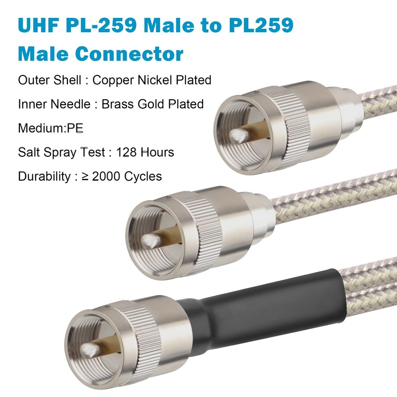 - ⭐Strong Link PL-259 Connectors -- High quality pl-259 connectors combined with good welding make the connector not easy to break off from the cable.The length of heat shrink tube that connect the rg8x cable and PL-259 connector is upgraded to 2.2",which can better protect the connector from falling off.