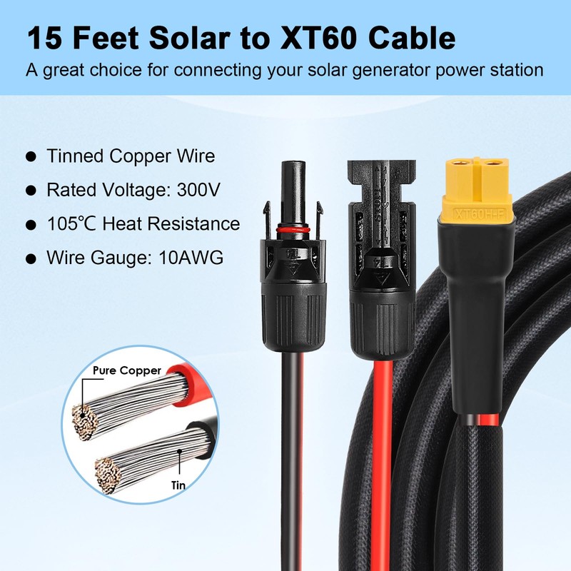 - 【High-Efficiency Charging Cable】This solar to xt60 cable use 10AWG tinned copper wire with high quality PVC nylon material (Heat resistant to 105℃).Tinned copper has low resistance,antioxidant and anti-corrosion which ensures good electrical conductivity and good durability,providing stable current for your device.