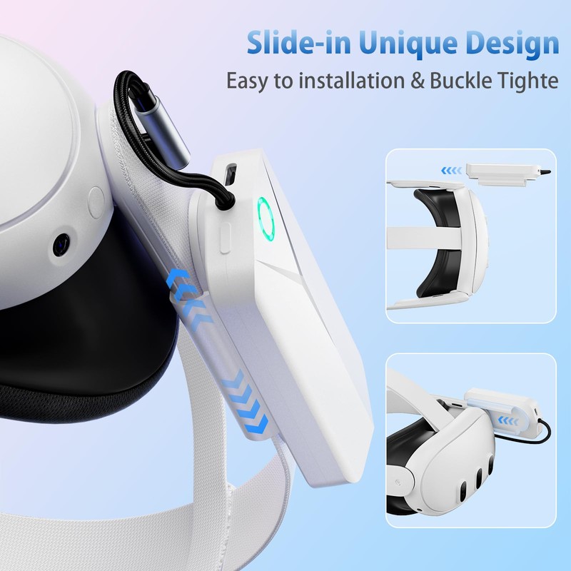 - Great Design: Latest head strap battery pack is specially designed for oculus/meta quest 3 and 2. Exclusive mold, portable to take, unique shape and annular battery display design is perfect for Quest headset. Fits VR body perfectly and won't fall, perfectly avoids the headphone jack, give you better VR experience.