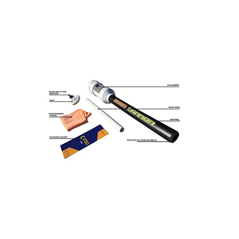 Are you ready to be the KING of backyard fun? Thanks to Team Moon Cannon, you will be. The insane performance of our potato gun is simply unmatched, featuring engineering that maximizes potato propulsion. Feel the intense adrenaline rush as you EXPLODE potatoes over 100 yards and clear the tree-tops. Our mission is to deliver an unforgettable experience to the whole family. Become the HERO of your next Party or Neighborhood bbq. Moon Cannon is a Blast, Every Time. (Cannon, Cap, Piezo Igniter, Ram Rod, Microfiber Towel, Cannon Guide Included) This product may require Trial and Error. Detailed Instructions contained in Cannon Guide and YouTube Tutorial Videos, additional guidance offered by Customer Service. Recommended Fuel: Hair Spray (Flammable Aerosol Spray)