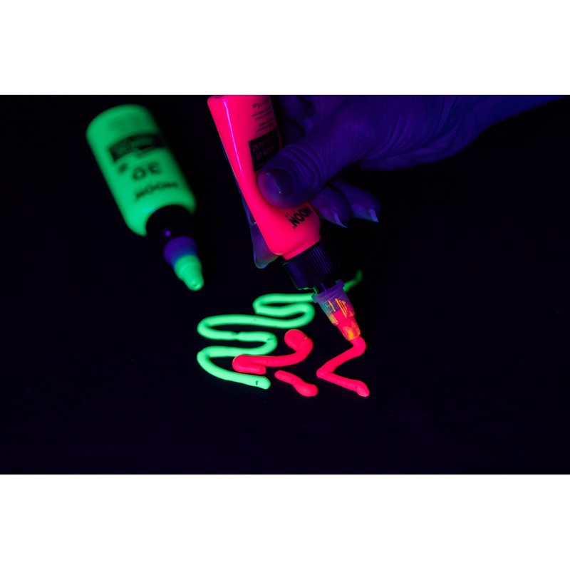 - MOON GLOW NEON UV 3D FABRIC PAINT - Highly pigmented, permanent Neon UV fabric paint for long-lasting, eye-catching designs. All 8 striking colours shine neon bright by day and emit an immense night-time glow under UV/black lights.