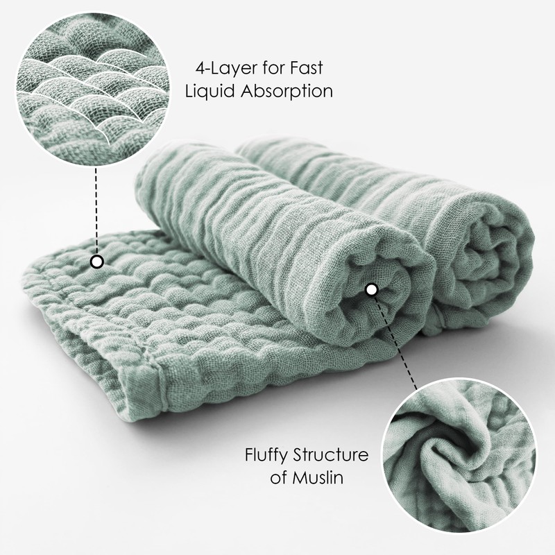 MOON PARK Baby Washcloths, 12 Pack - 12x12 Inches, Small Burp Cloths and Baby Wipes - 100% Cotton Muslin Ultra Soft for Newborn, Infant and Toddlers - Grey, Green and Slate