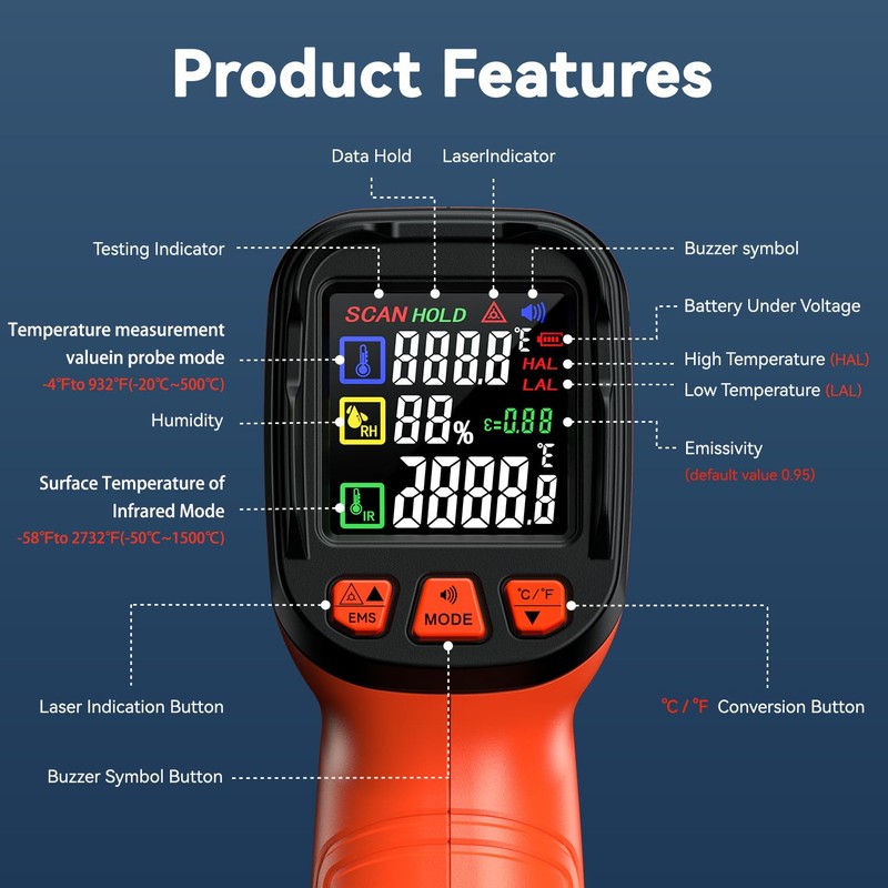 - Precise Dual-Mode Measurement: This infrared thermometer gun features dual measurement modes for both surface and internal temperatures. The surface temperature range is from -58°F to 1796°F (-50°C to 980°C), and internal temperature measurements can be taken with a K-type thermocouple, ranging from -58°F to 572°F (-50°C to 300°C). It displays real-time ambient temperature and humidity, with a surface measurement accuracy of ±2% and internal temperature accuracy of ±1.5%.