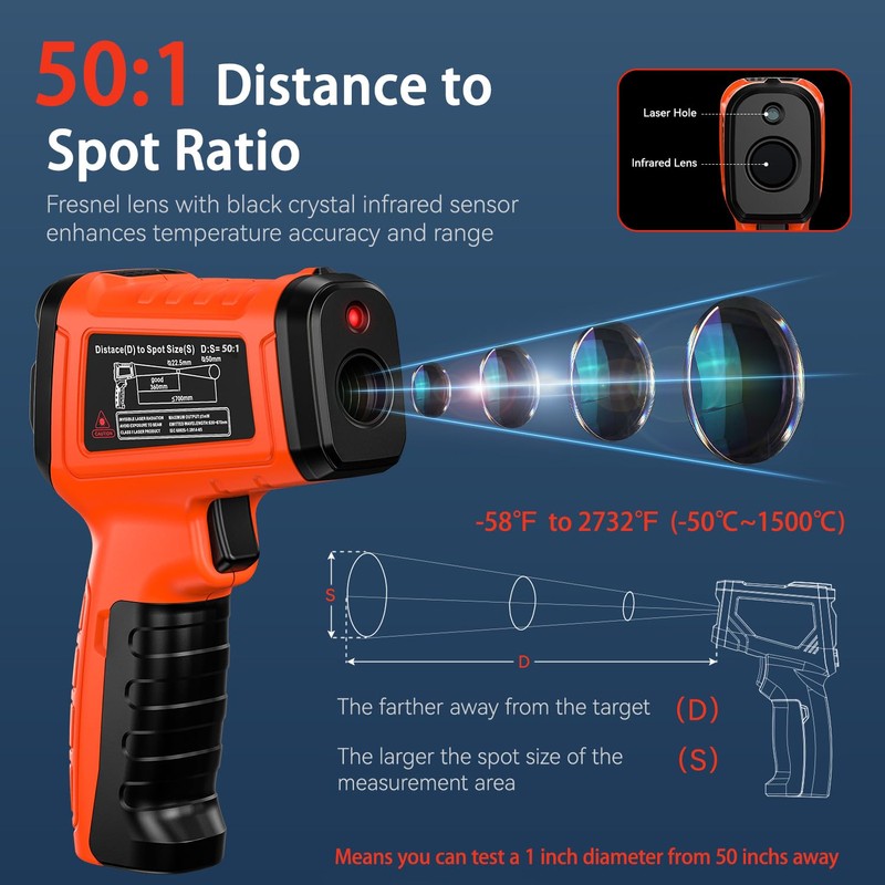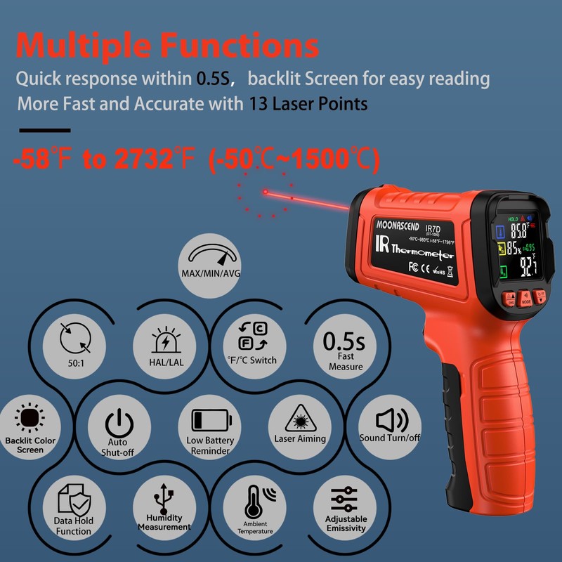 MOONASCEND -58°F to 2732°F Infrared Thermometer,50:1 Laser Thermometer Gun for Oven、BBQ、HVAC,Humidity Measurement for Wood、Wall ,IR Temperature Gun for Engine 、Forging ,Industrial & Home Use