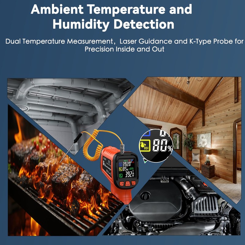 - Wide Range of Applications**: Ideal for high-temperature industrial environments such as pizza ovens, furnaces, kilns, welding, and forging. The included K-type thermocouple extends its use for food testing, wood and wall monitoring, and HVAC systems. The humidity monitoring feature is also perfect for equipment maintenance and material monitoring.