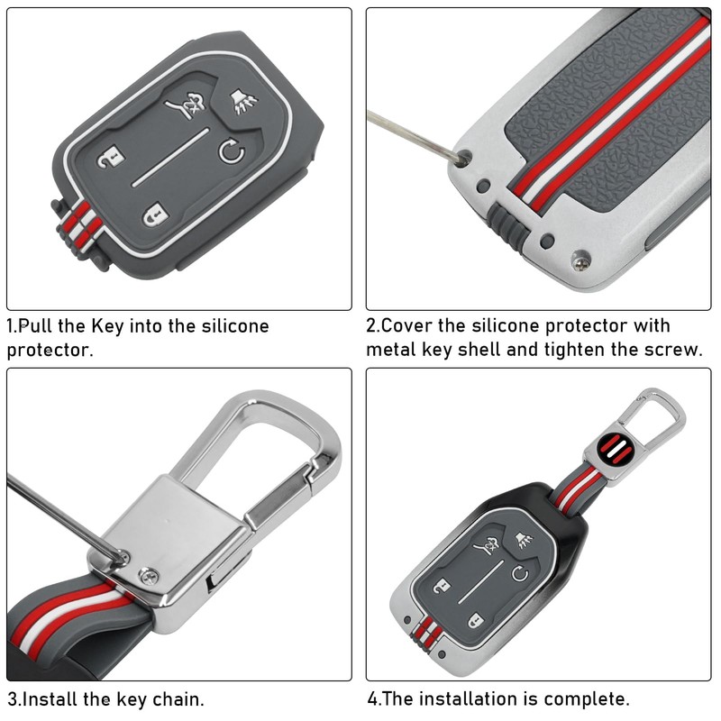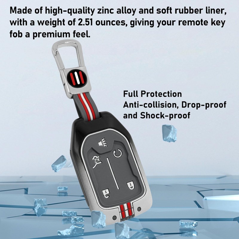 • 🎁【Custom Design】Compatible with GMC/Chevy Key Fob Cover 5-Button is specifically customized according to the original car key 1:1 modeling.The All-inclusive design will perfectly fit your key and make it more beautiful without compromising functional use.Our Key Case is suitable for many occasions.Combination of zinc alloy and silicone cover is more suitable for business occasion than pure silica key case.Fashionable and sporty key rope makes our Key Shell suitable for casual occasion as well.