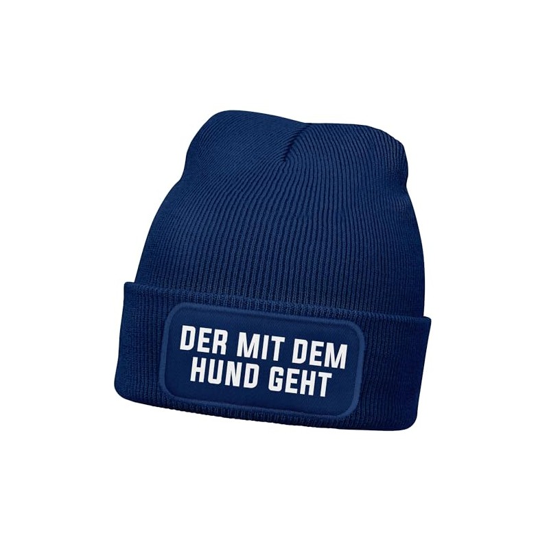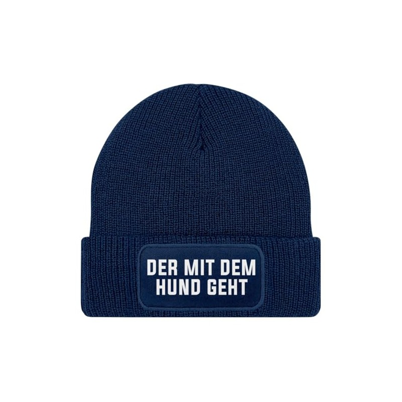 MoonWorks® Herren Beanie Strickmütze mit Patch Spruch Der mit dem Hund geht Aufdruck Lustig Mütze Männer Dunkelblau Unisize