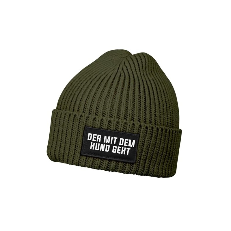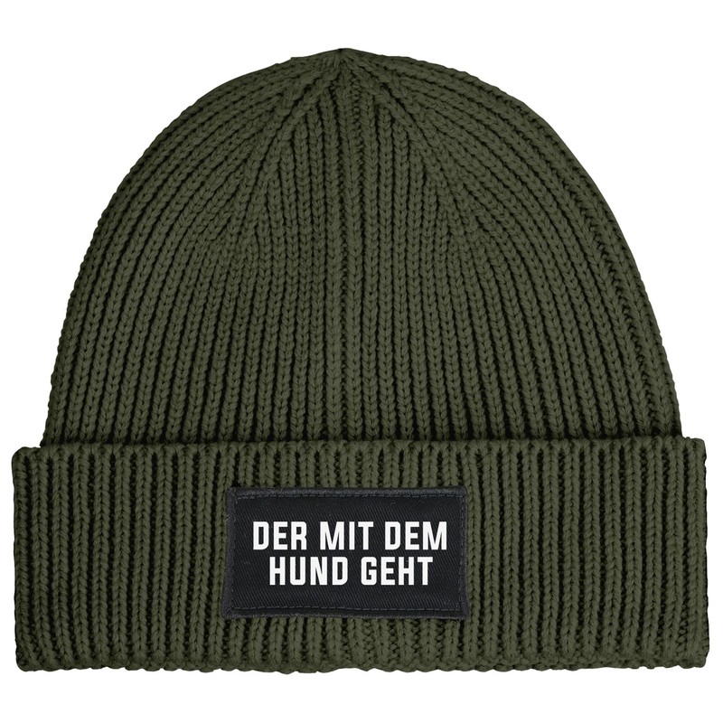 MoonWorks® Men's Beanie with Patch, Knitted Hat with Saying "Der mit dem Hund geht (Der mit dem Hund geht"), dog olive