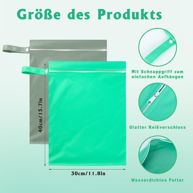 Moorle Pack of 2 Wet Bags 40 x 30 cm, Waterproof Laundry Bag, Grey & Green, Reusable Travel Wet Bag with Zip, Small Wet Bag Swimming for Swimsuits, Beach Towels, Nappies