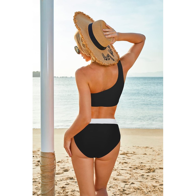 MOOSLOVER Women Cutout One Shoulder High Waisted Bikini High Cut Two Piece Swimsuits(L,Black White)