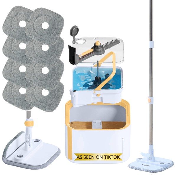 Mop and Bucket System PRO with Removable Water Tank Duo Bucket & Spin Mop System, Self Wringing, Separates Clean from Dirty Water, Folding Head, Dual Brush System, 8-pc Machine Washable Pads