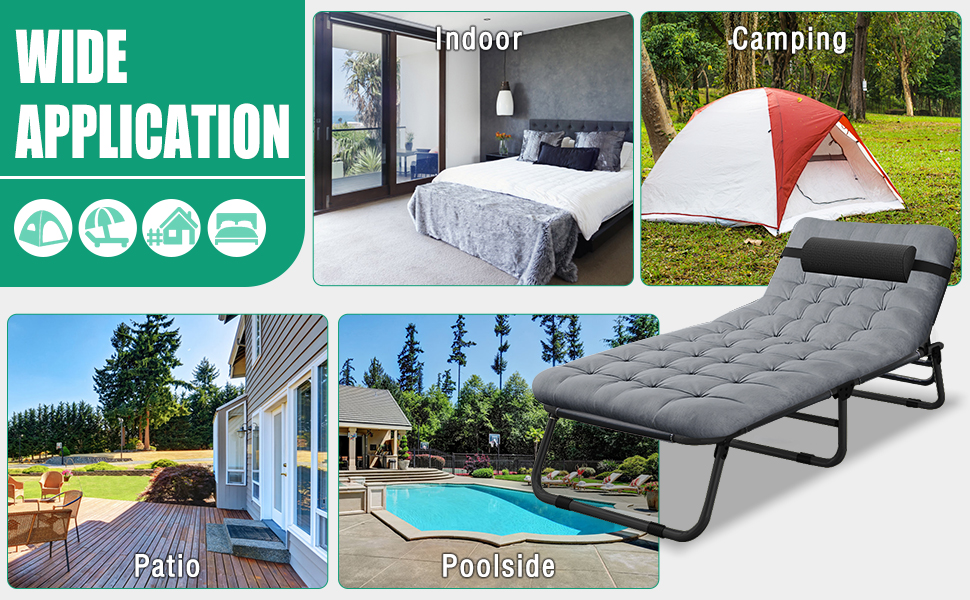 ✅【Safe and Comfortable】: Our folding cot beach lounger is designed with anti-slip feet pads to ensure stability. The folding camping cot also has a removable pillow, which provides comfortable support for your neck and head to help you fall asleep quickly.
