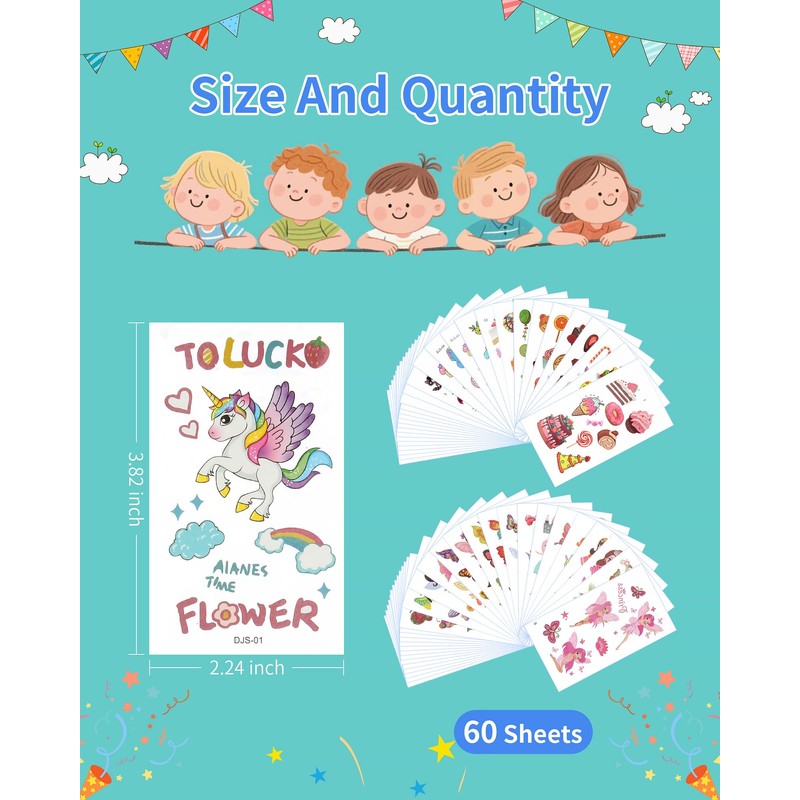 - 【 Quantity and Size 】 The set includes 60 Sheets (More than 500 Patterns) tattoo stickers, suitable for both boys and girls, which means every child at the party can get a cute tattoo. The size of each sheet of paper is 3.82 "x 2.24".