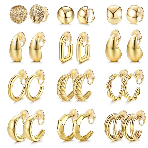 Morfetto 12Pair Clip on Hoop Earrings for Womens Gold Clip on Earrings Twist Round Chunky Hoop Clip Earrings No Piercing Fake Earrings Gold
