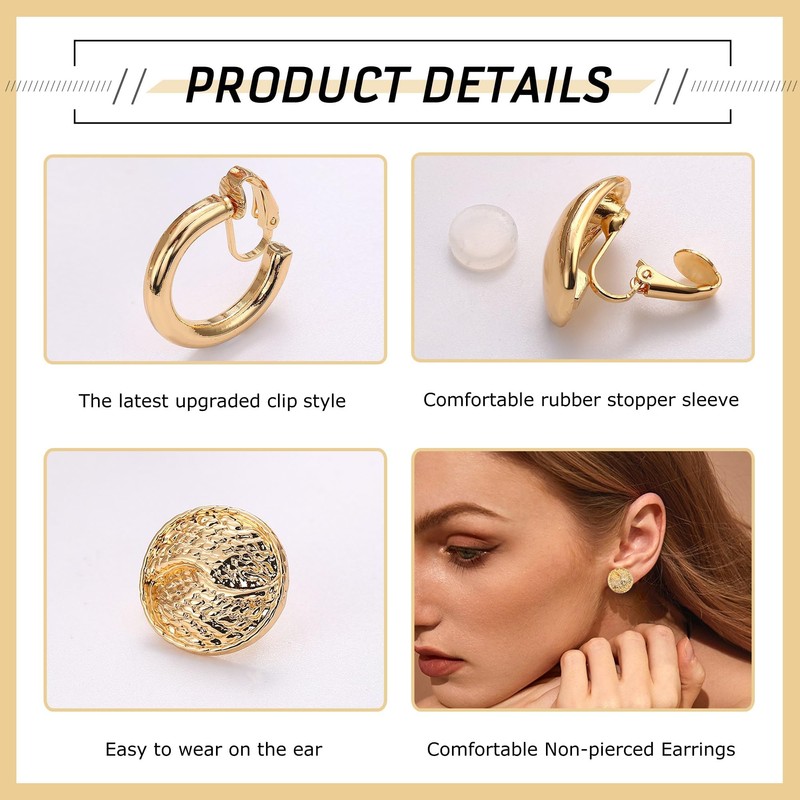 - Clip On Earrings Set--One order includes 12 pairs of clip-on earrings in different styles, including round clip earring, twist hoop earring, square fake earrings, geometric chunky hoop clip earring, etc. Different styles of non-pierced earrings provide a variety of options for your daily wear
