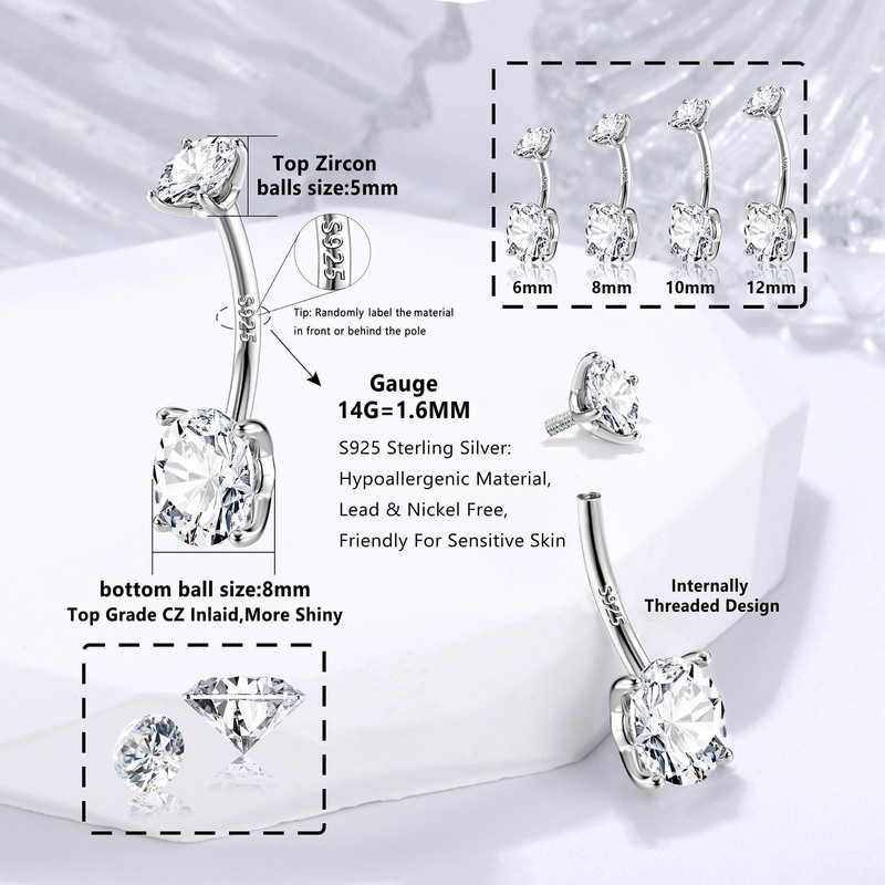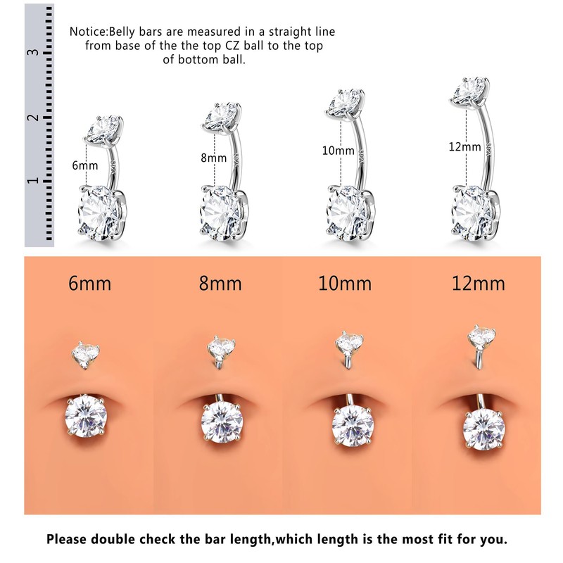 - Precision and versatility size titanium belly button piercing gauge 14G = 0.06 inches (1.6 mm), surgical steel belly button piercing bar length: 0.24 inches - 0.47 inches (6 mm-12 mm), zirconia balls size: 0.2 inches (5 mm) / 0.31 inches (8 mm). Perfect for both subtle and statement looks, cut for most people, while the 14 g belly piercing g 92 5 silver gauge provides a tight fit