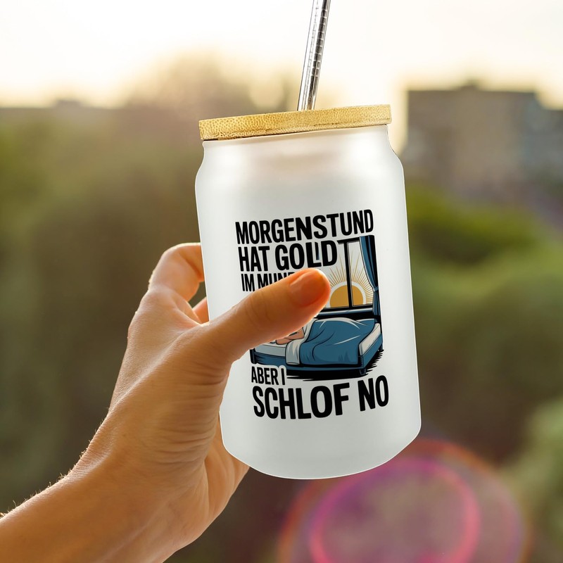 - Unser lustiges Trinkglas zeigt eine schlafende Person, die friedlich im Bett liegt, während draußen die goldene Sonne aufgeht. Mit dem humorvollen Spruch „MORGENSTUND HAT GOLD IM MUND, ABER I SCHLOF NO.“ in großen Buchstaben, bringt es ein Lächeln auf jeden Mund. Perfekt für alle, die ihre Liebe zum Schlafen feiern!