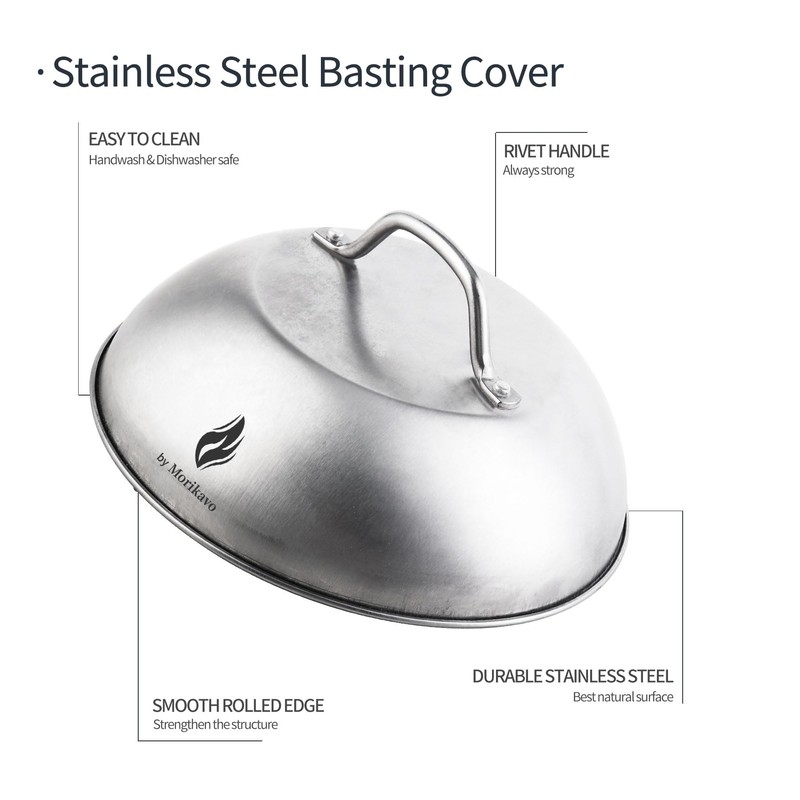 - 【ABOUT MY VERSATILITY】 Morikavo Melting Dome:This remarkable 9 inch stainless steel round melting dome is the perfect size for trapping heat to cook evenly. Ideal for concentrating heat to melt cheese, steam vegetable quickly and cook steak, sausage evenly, Reduce your cooking time, Avoid overcooking the meat to keep food tasty, Prevent hot oil, flare-up or food debris from splashing, Also can keep food warm or prevent dust.