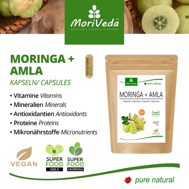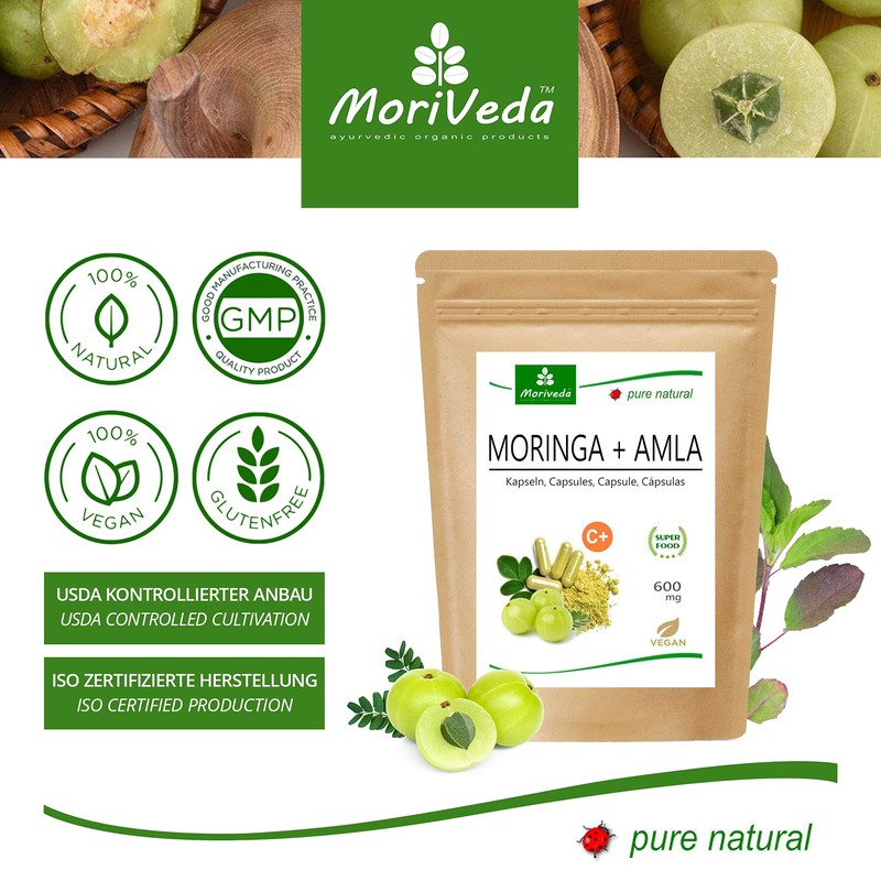 Moringa + Amla Capsules 600 mg - Immune System and Energy - 2 Month Supply - Moringa Oleifera Leaf Powder and Amla Powder with Natural Vitamin C - Vegan and Gluten-Free - 120 Caps of MoriVeda