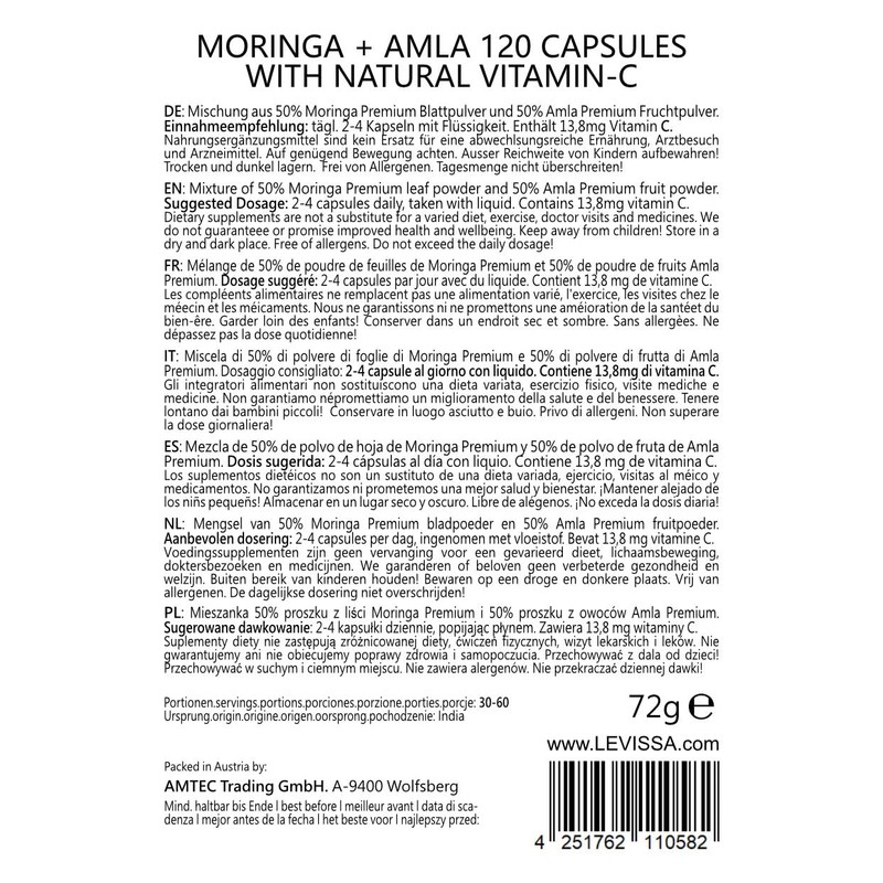 - High dose: each capsule contains a balanced blend of 50% Moringa Oleifera leaf powder and 50% Amla powder. Packed in a resealable zip bag that preserves the freshness and effectiveness of each capsule.