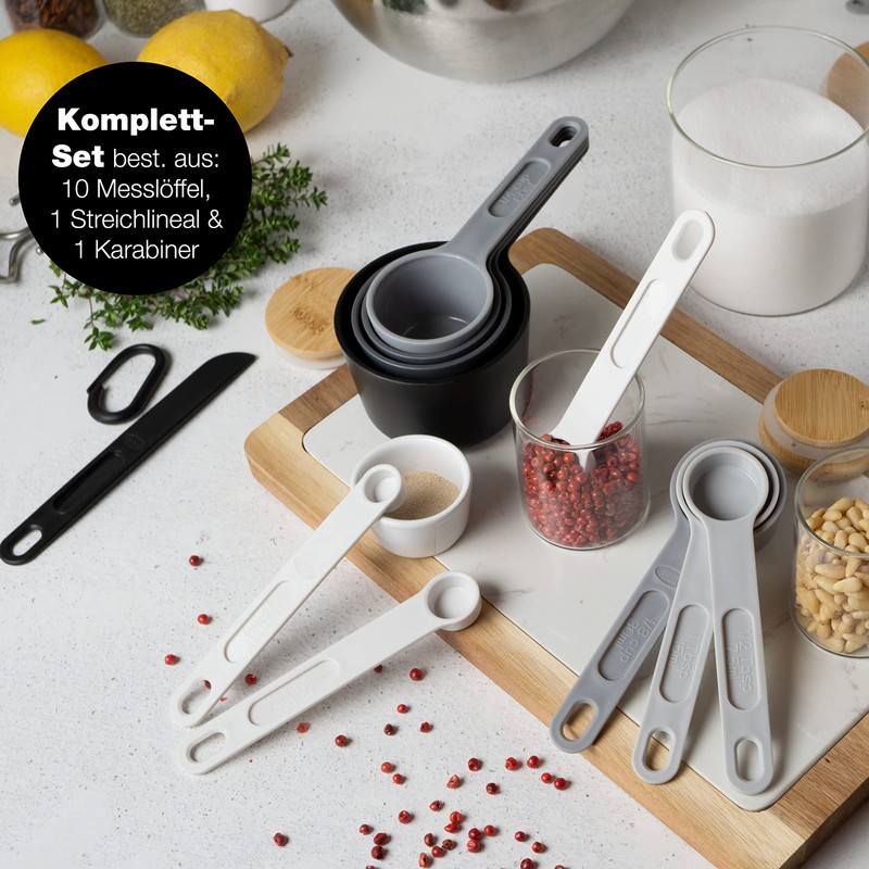 The stackable measuring spoons from Moritz & Moritz should not be missing in any kitchen: with dimensions from 1.25 to 240 ml, there is the right measure in 10 steps for almost every exact amount of different cooking and baking ingredients. Thanks to the clearly visible information in the handle and the comfortable handling, you can measure liquid and dry components easily, safely and precisely. The innovative, space-saving box system and a included carabiner hook for holding the measuring spoons together complete the practical application perfectly.