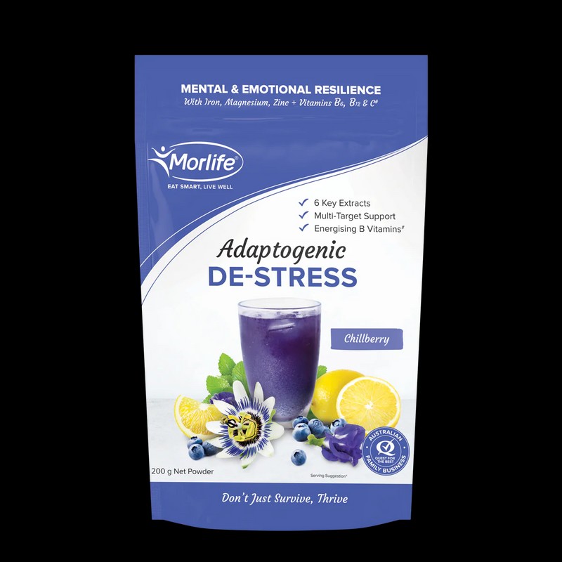 Feeling wired, tired and overwhelmed? Stay cool, calm and collected with Adaptogenic De-Stress, the ultimate stress-less elixir for today’s modern age. Formulated with Iron, Magnesium, Zinc + Vitamins B6, B12 & C to support your mood and fight fatigue to sharpen your muddled mind#. Packed with adaptogenic herbs including ginseng and licorice as well as soothing passionflower and lemon balm. Adaptogenic De-stress is a godsend to stress heads everywhere, helping you cope no matter the scope.