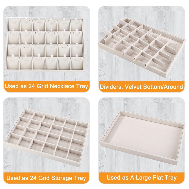 - 【Premium Velvet Inner and Around 】: Mornajina 24 Grids Jewelry Organizer Tray is made of durable composite board wrapped in glossy ice velvet fabric everywhere, perfectly to hold a collection of jewelry, accessories and other knickknacks. Especially for velvet at bottom, it will help reduce friction, clash, and can protect jewelry from scratches and other damage.
