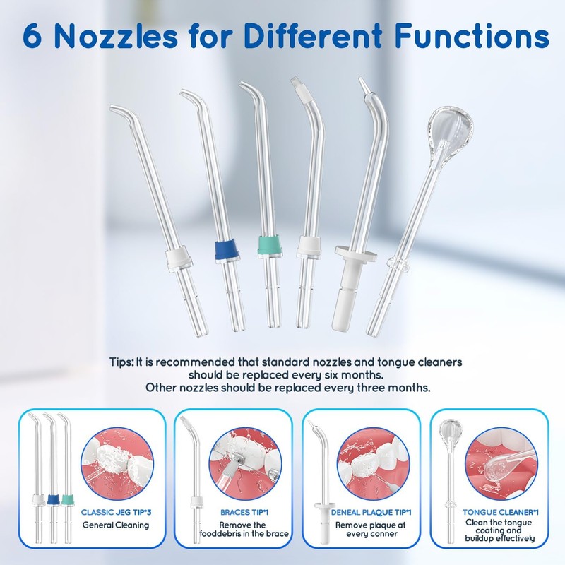 【6 Düsen für die ganze Familie】 Die Mornwell Munddusche wird mit gewöhnlichen Hochdruckaufsätzen in 3 verschiedenen Farben und 3 weiteren Wasserstrahlaufsätzen für spezielle Zwecke geliefert. Sie können mit Ihrer ganzen Familie teilen. Mit diesen 360-Grad-Düsen können Sie leicht auf alle Bereiche des Mundes zugreifen, um Zahnstein, Speisereste zwischen Zähnen und Zahnfleisch gründlich zu entfernen.