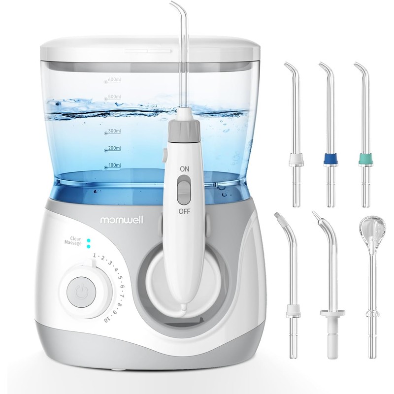 Mornwell Feststehende Munddusche, Profi-Water Flosser, Zahnzwischenraumreiniger mit 10 Druckstufen und 6 Aufsätzen, integrierter Timer(Weiß)