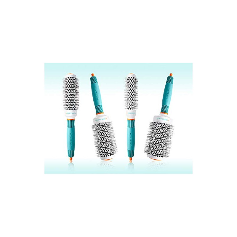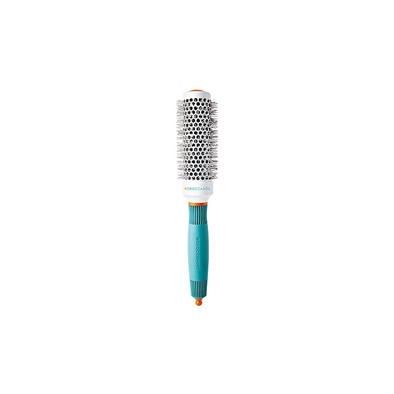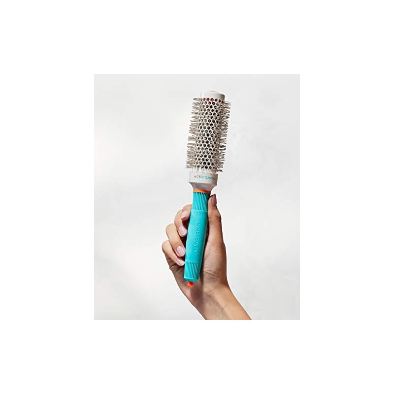 A high-performance styling tool for in-salon or at-home use, the Moroccanoil Ceramic 35 mm Round Brush is perfect for creating loose waves and volume on medium-length hair. High-quality materials with ionic and ceramic properties, combined with cutting-edge construction, provide an effortless styling experience with flawless results, especially when blow-drying. Brush bristles contain ions that repel water, causing moisture to evaporate quickly, while ceramic provides even heat distribution, resulting in enhanced drying time. Ions also act as a conditioner to the hair shaft, leaving strands healthy, shiny and full of body. Durable, high-quality construction makes this brush long-lasting. It also features a sectioning tip stored inside the handle.