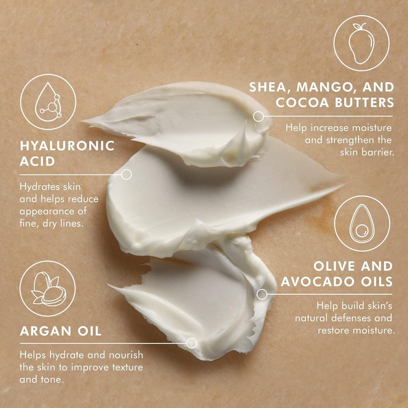 Moroccanoil Manteca Corporal hidrata y nutre la piel con aceite de argán y ácido hialurónico. Sus ingredientes como aceites de argán y aguacate, y mantecas de karité, mango y cacao, nutren la piel, mientras que el ácido hialurónico retiene la hidratación. Se recomienda masajear sobre la piel seca, enfocándose en las zonas más ásperas.