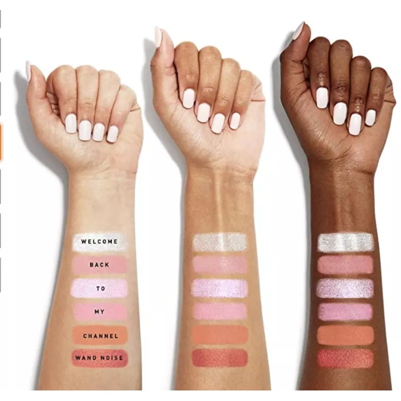 • ROW 1: Welcome / shimmering crystal Back / matte blush To / shimmering pink pearl My / matte cotton candy Channel / matte poppy Wand Noise / blood orange sheen